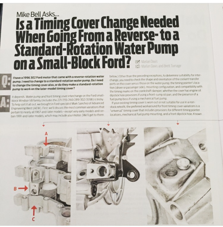 If you haven't got a chance to check out The Hot Rod Magazine, May Issue, you are missing out! In this issue, we able to be apart of this awesome magazine. Our Mustang Timing Chain Cover with Molded Timing Pointer came into play within this article explaining if a timing chain cover was needed when going from a Reverse-to a Standard-Rotation Water Pump on a Small-Block Ford. (PN: ENG-000-409)