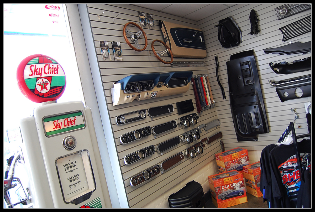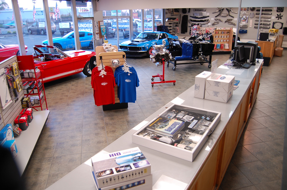 Their facilities consist of a newly overhauled and expanded 2000 sq. foot showroom with a fully stocked warehouse. They keep this monster supplied with today's latest parts and accessories from California Pony Cars (CPC) for all of your Mustang needs.