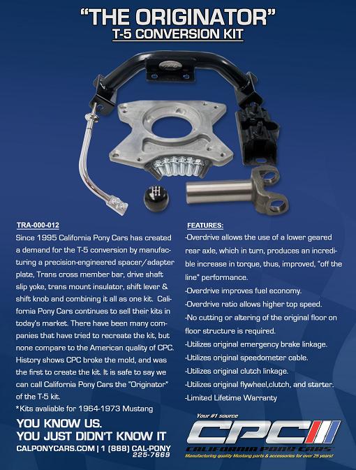 The T-5 kit made it easy to install a late model Borg-Warner T-5 or Tremec TKO, 5 speed manual transmissions in a 1964-1973 Mustang. The kit allowed drivers to take advantage of the 1st gear ratio which increased torque and low end performance in 5th gear. It was an incredible boost in performance. The 5 speed conversion allowed utilization of the existing oem emergency brake linkage, speedometer cable, clutch linkage, flywheel, clutch, starter, throw out arm & bushings with no cut outs required. The T-5 conversion kit is like so many other swaps, it won’t simply bolt in. CPC made it easy by creating multiple conversions for early and later models manual transmission bell housings. They also created an adapter plate that provides mounting holes for the attachment of the plate and securing the transmission. The 5 speed conversion kit comes complete with a precision engineered spacer/adapter plate, Trans cross member bar, drive shaft slip yoke, trans mount insulator,shift lever & shift knob.