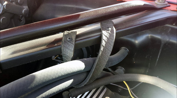 Our heater hose retainer straps come with hardware that mount to shock tower brace bar, this rubber strap is a lot more durable and much cleaner looking than using zip ties that become brittle and break with the engine heat.